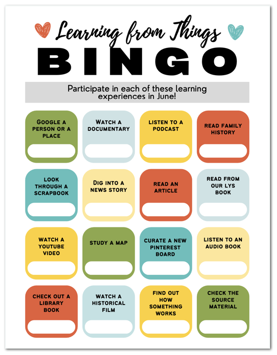 How are we in June—already? This is our transition from spring into summer and we’re dedicated this month to Learning from Things! YES, we’re going to make it FUN—look for a BINGO board you can print and stick to your fridge, to remind and reward your efforts to access and be grateful for abundant learning resources at our fingertips—I hope during this less structured season that YOU can create moments of relaxed learning and creating!
